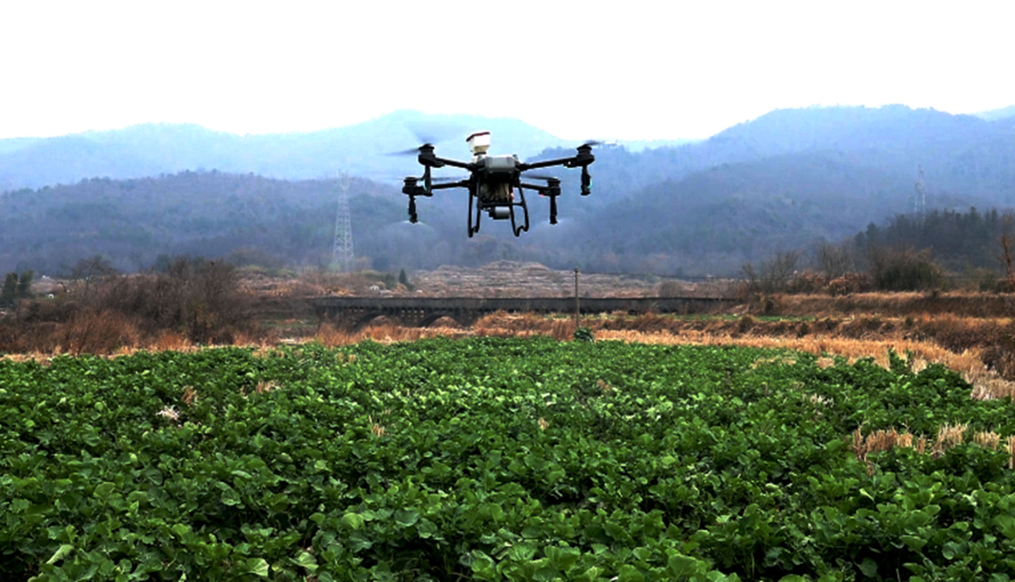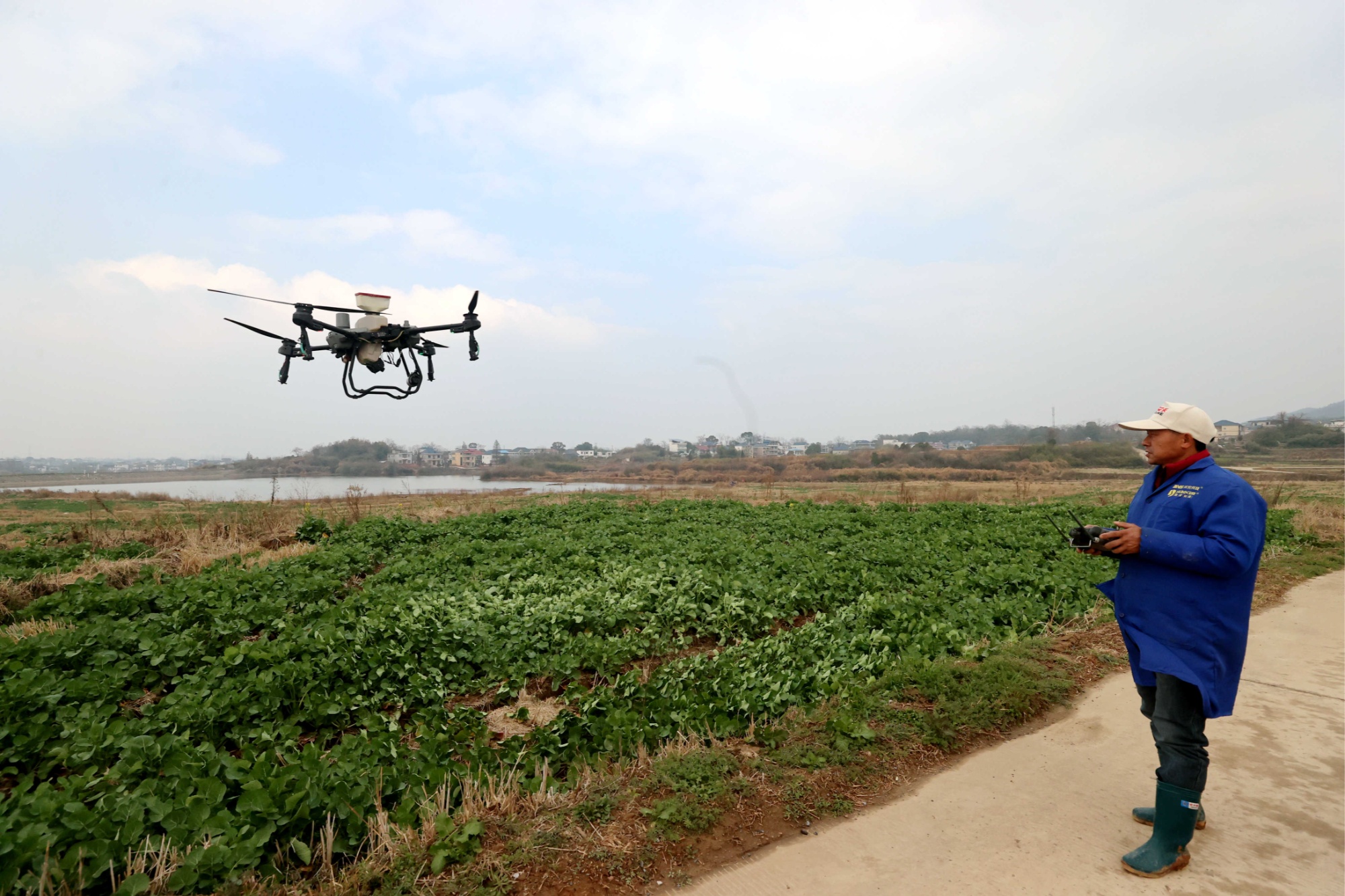 在湖口县大垅乡马步村、芦岭村,油菜田里绿意盎然。农户石朝志正控制着无人机飞到油菜地上空,依照设定航线履行飞防使命,雾化后的药液、肥料从机身下的喷淋头均匀地洒在油菜植株上,为油菜披了一层“防护衣”。